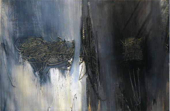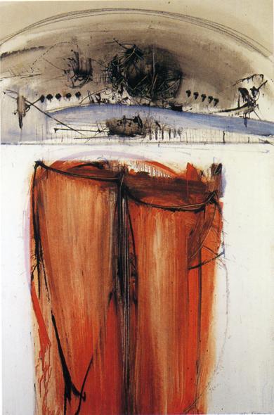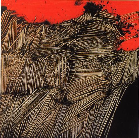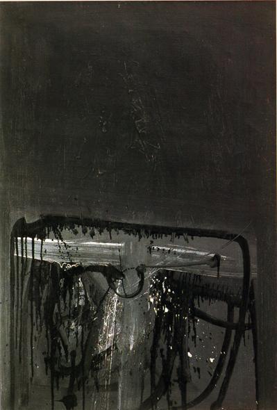 Sudi fondo omogeneo, indefinito e uniforme, dai toni generalmente grigioterrosi, una serie di figure impreviste e instabili, tracciate in modo deciso ed energico e costituite dall'intreccio di segmenti verticali e obliqui, legati tra loro da alcuni tratti orizzontali, emergono in tutta la loro sconvolgente forza espressiva. I segni sono graffi, aculei, abrasioni aggressive, lacerazioni sofferte. Lo spazio è ritmato come da violente ferite, da brusche interruzioni, da misteriose impronte di un mondo che chiede di riaffiorare in superficie.