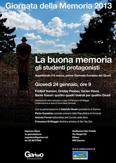 I quadri teatrali, dai titoli: "Nansen, l'esploratore di anime", dedicato al celebre norvegese, "Io non dimentico", dedicato al vice-presidente del parlamento bulgaro Peshev, "Le fave sono fave, i piselli sono piselli", dedicato al presidente ceco Havel, e "L'infelicità araba", dedicato al giornalista libanese Samir Kassir, saranno inframmezzati dal dibattito tra quattro uomini che vivono quotidianamente l'esercizio della testimonianza: Antonio Ferrari, editorialista del Corriere della Sera, Gabriele Nissim, presidente di Gariwo, Pietro Kuciukian, console onorario d'Armenia, e Francesco Di Maggio, regista e direttore artistico di Ser Tea Zeit.